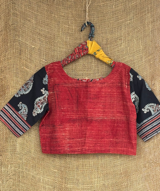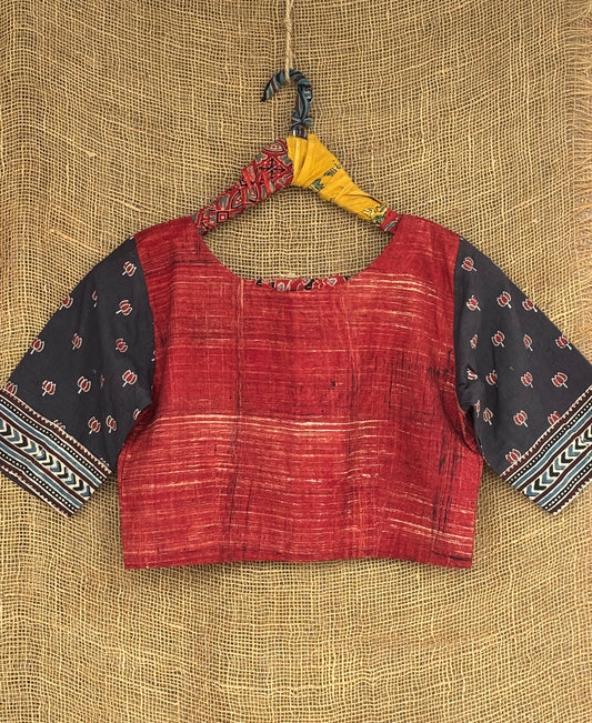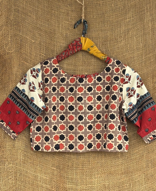 Earthy brown patchwork sleeves ajrakh cotton blouse