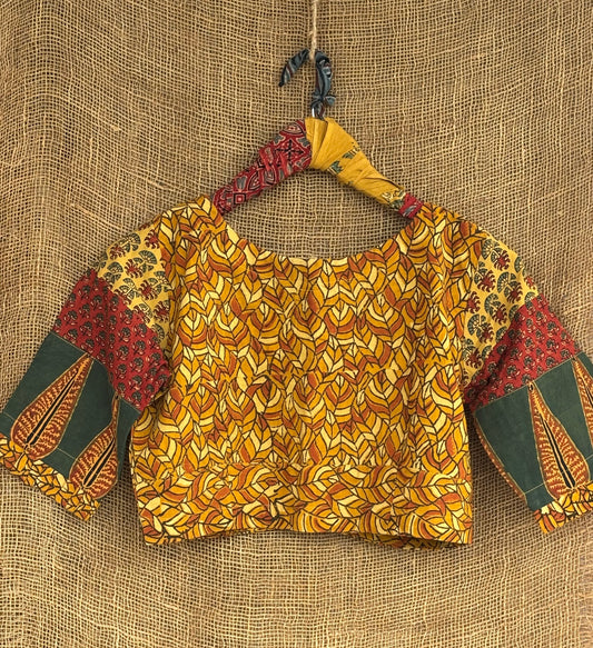 Mustard patchwork sleeves ajrakh blouse