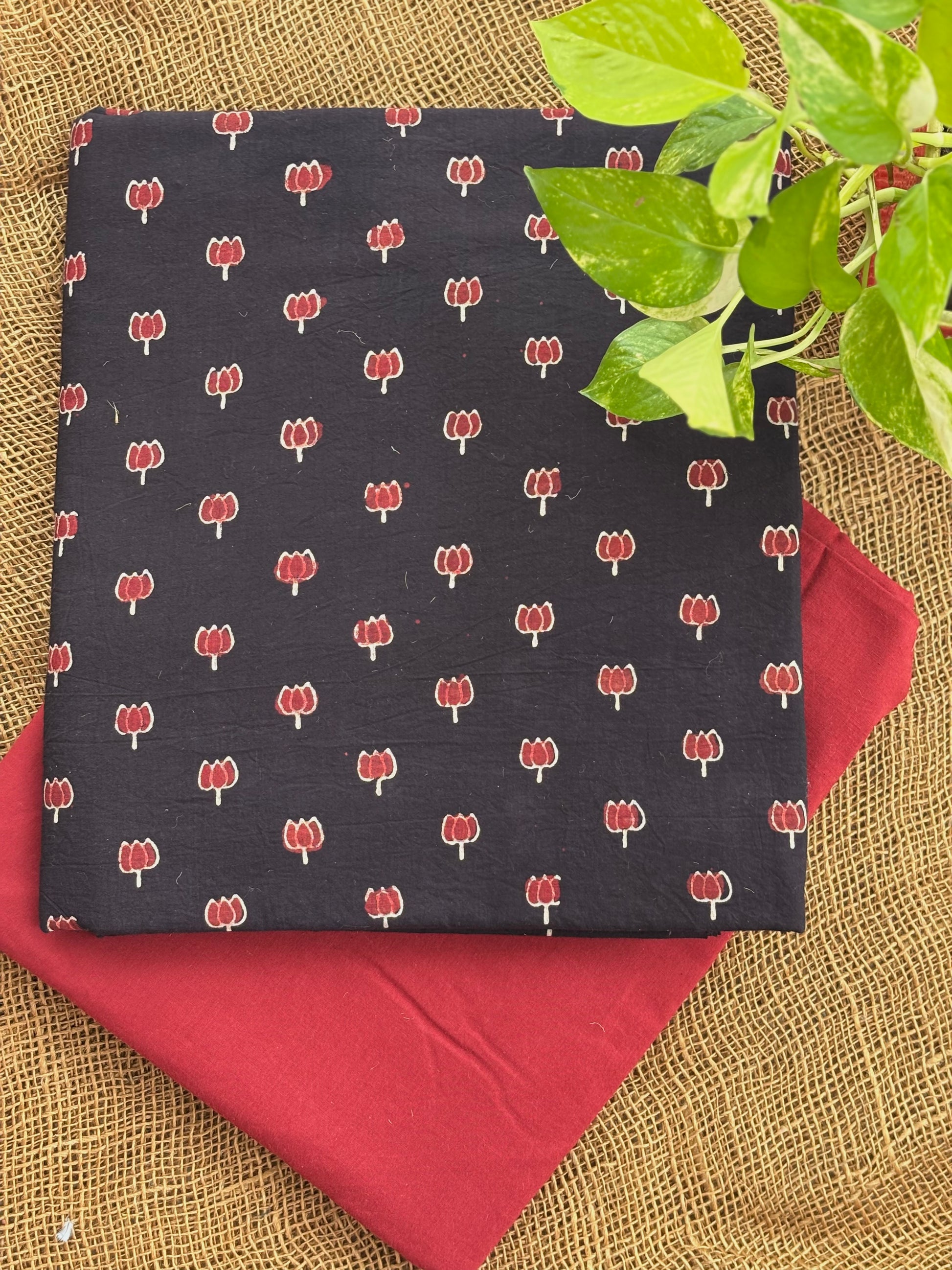 The top fabric features a brown base adorned with delicate deep red lotus motifs, hand-block printed using the time-honored Ajrakh technique — a quiet nod to tradition with a fresh, grounded vibe.