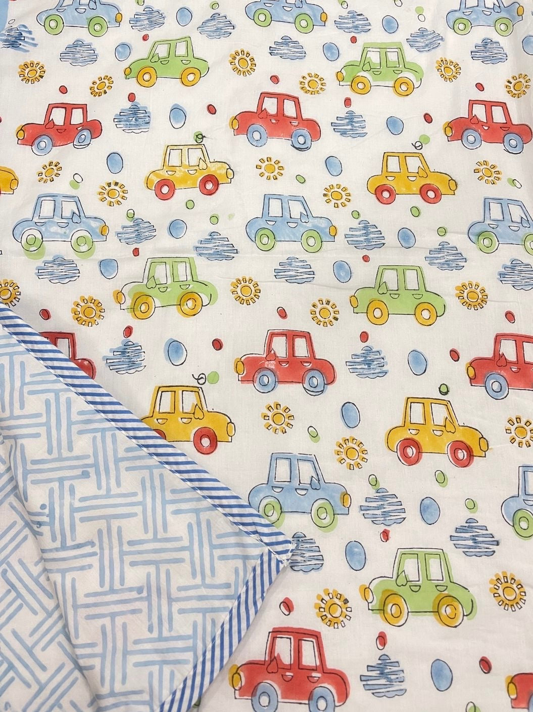Bring a splash of colour and joy to your little one’s world with this car-themed reversible baby dohar. Hand block printed on ultra-soft cotton mulmul, it features vibrant red, yellow, green, and blue cars surrounded by sun motifs, clouds, and playful patterns. The inner layer offers a subtle contrast with a soothing blue maze-like pattern, making it fun yet calming.