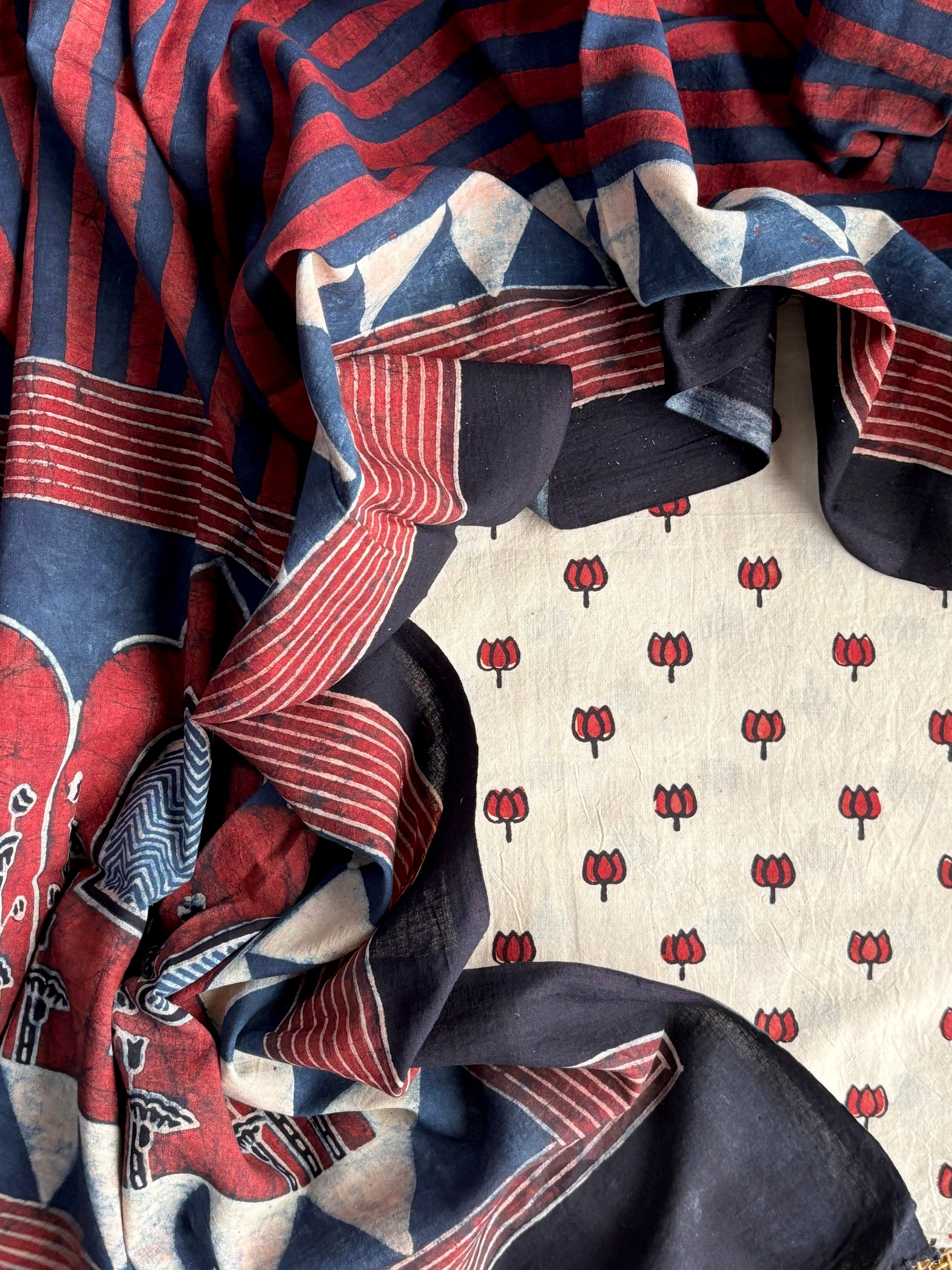 - Color Palette: Ivory, red and earthy Ajrak tones