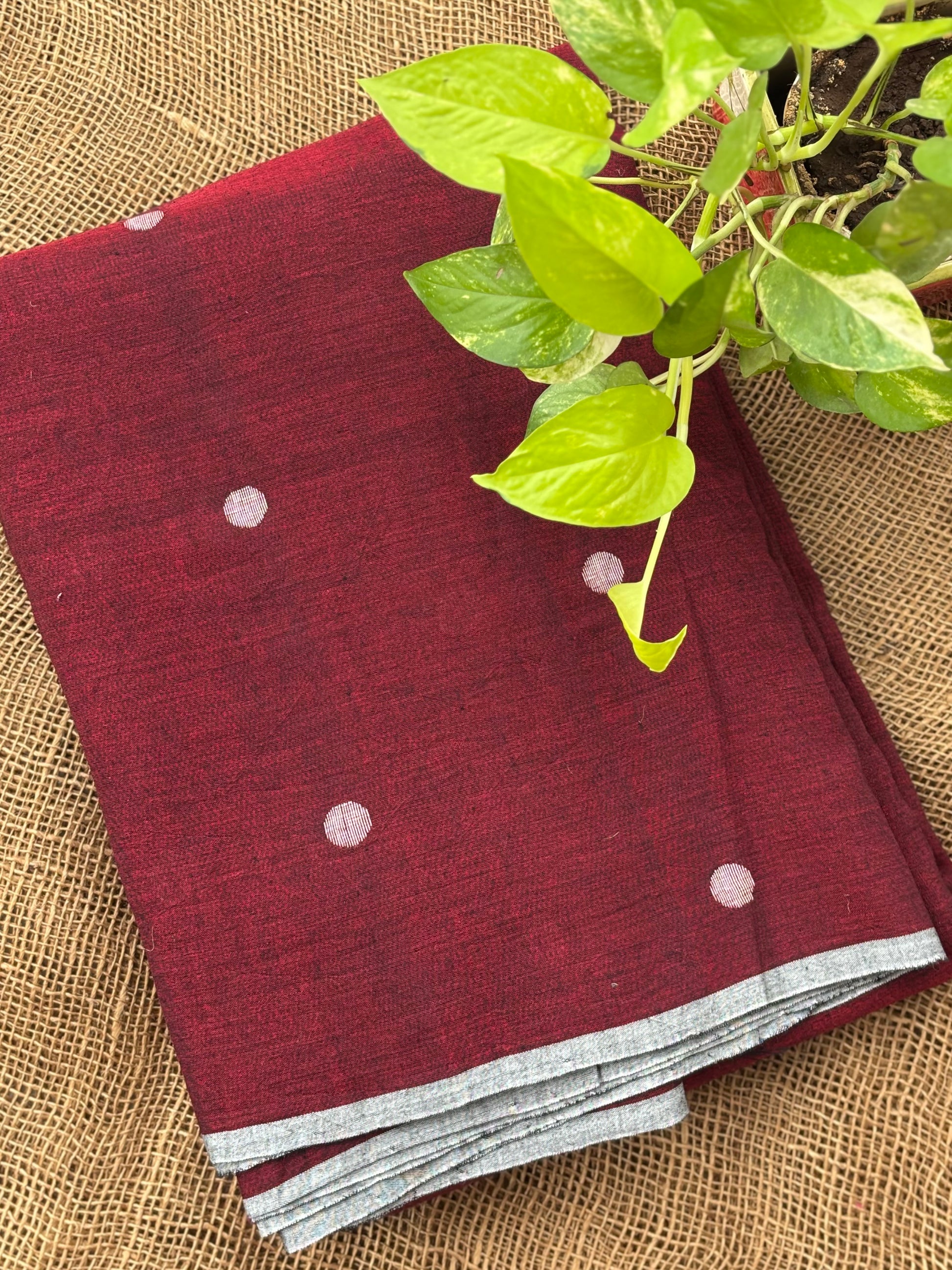 A deep maroon base scattered with delicate off-white polka dots, handwoven in the softness of pure mul cotton. This lightweight Jamdani fabric carries a playful yet poised charm — perfect for breezy kurtas, sarees, dresses, or home accents.