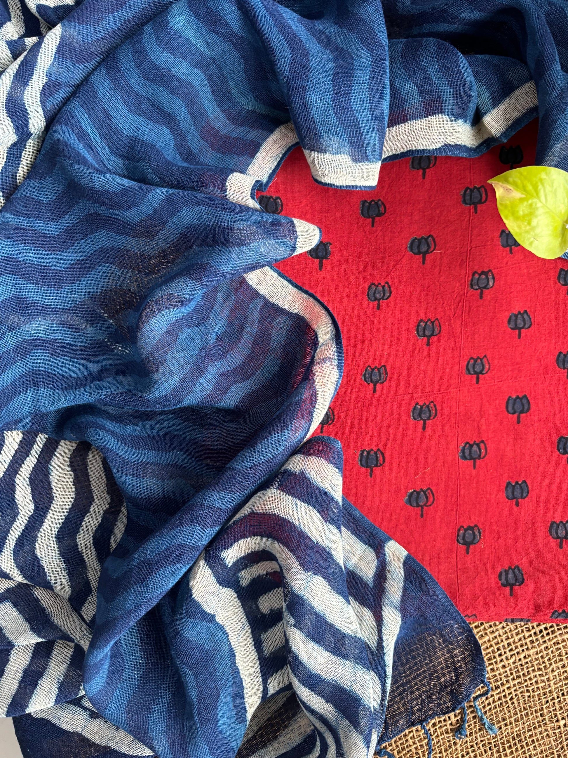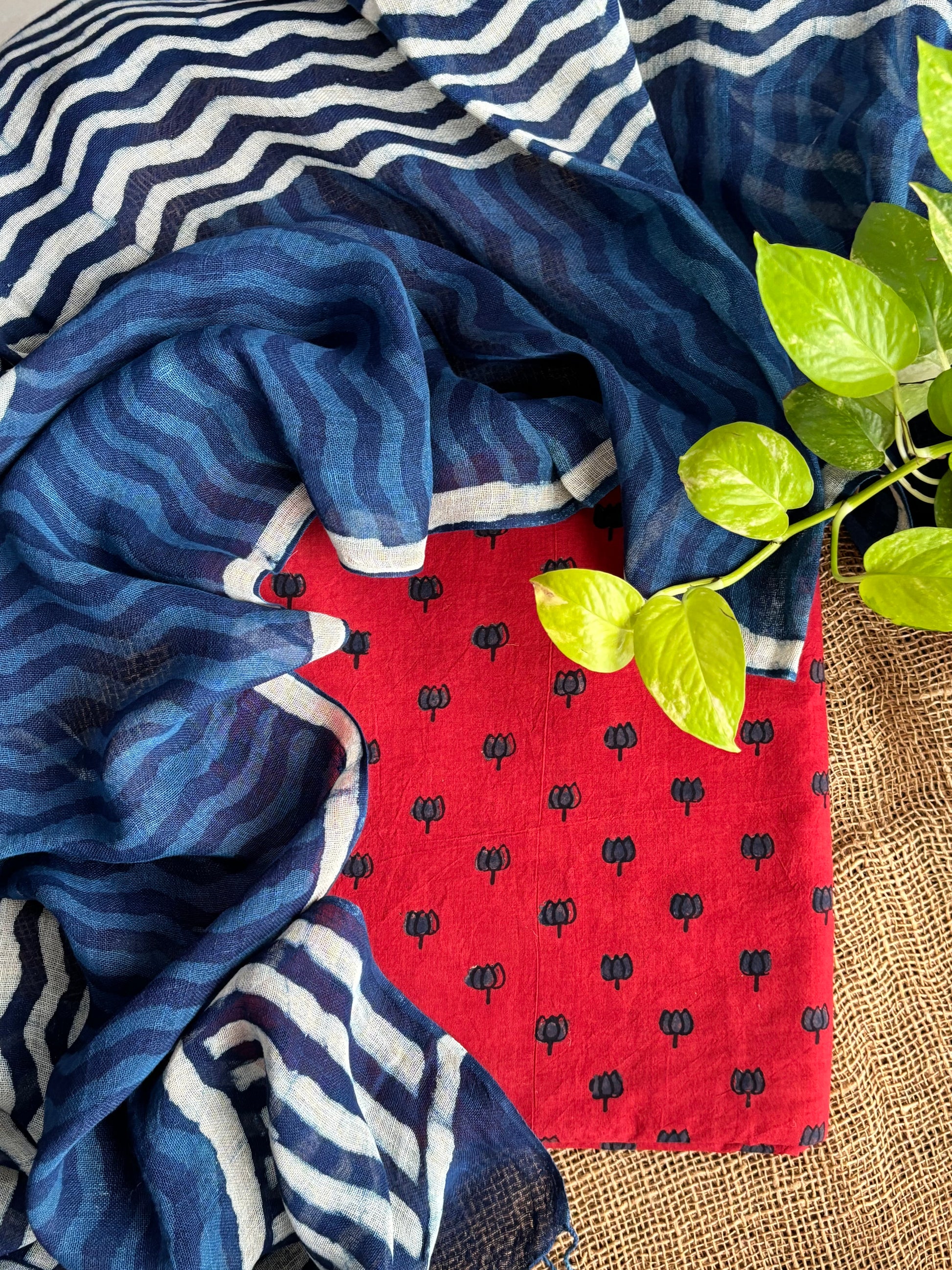 A graceful set featuring a red Ajrak-printed cotton kurta with blue lotus motifs, paired with a linen dupatta hand-block printed in stripes. The palette of red, blue and ivory blends tradition with a modern edge, making it effortlessly stylish.