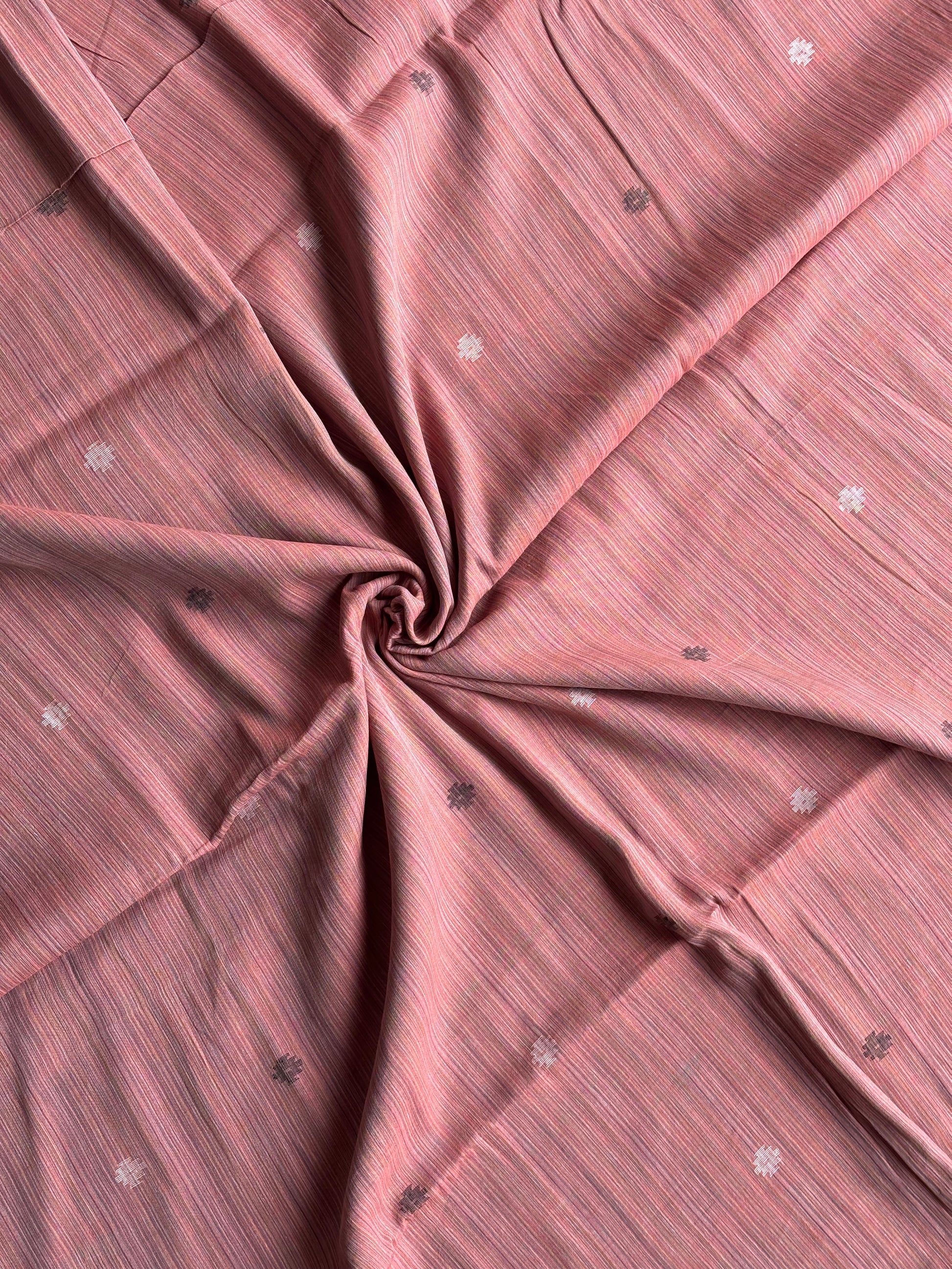 A rose pink base scattered with delicate stripes, handwoven in the softness of pure mul cotton. This lightweight Jamdani fabric carries a playful yet poised charm — perfect for breezy kurtas, sarees, dresses, or home accents.